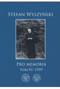 „Pro memoria. Tom 6: 1959” to kolejna część osobistych zapisków kardynała Stefana Wyszyńskiego, obejmująca wydarzenia z roku 1959. W tym okresie, będącym trzecim rokiem po odwilży październikowej, prymas Wyszyński dokumentuje swoje codzienne doświadczenia, refleksje oraz ocenę sytuacji społeczno-politycznej w Polsce. Szczególną uwagę poświęca życiu Kościoła, relacjom z władzami państwowymi oraz problemom społecznym. Publikacja stanowi cenne źródło wiedzy o historii Polski oraz duchowości prymasa, ukazując jego niezłomność i zaangażowanie w obronę wartości chrześcijańskich.